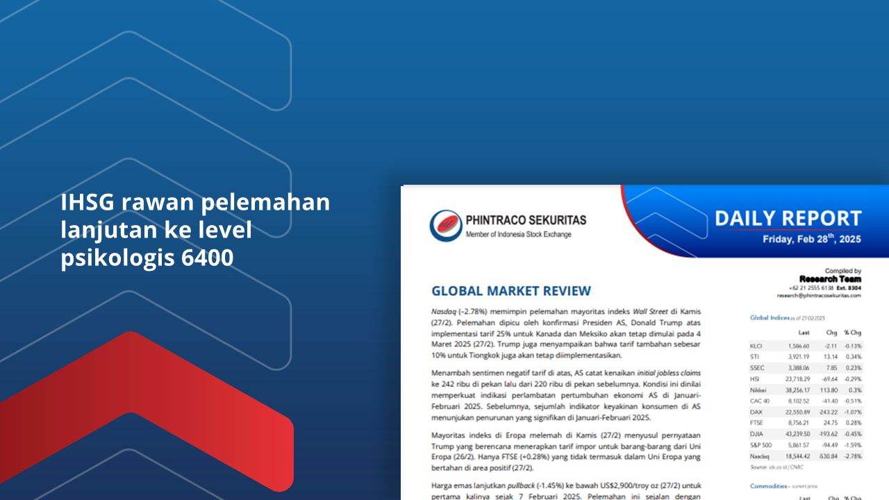 Nasdaq (+0.26%) catatkan technical rebound, sementara DJIA (-0.43%) berbalik melemah di Rabu (26/2). Dalam pertemuan kabinet pertamanya, Presiden AS, Donald Trump kembali mengkonfirmasi implementasi tarif untuk Kanada dan Meksiko. Dalam...