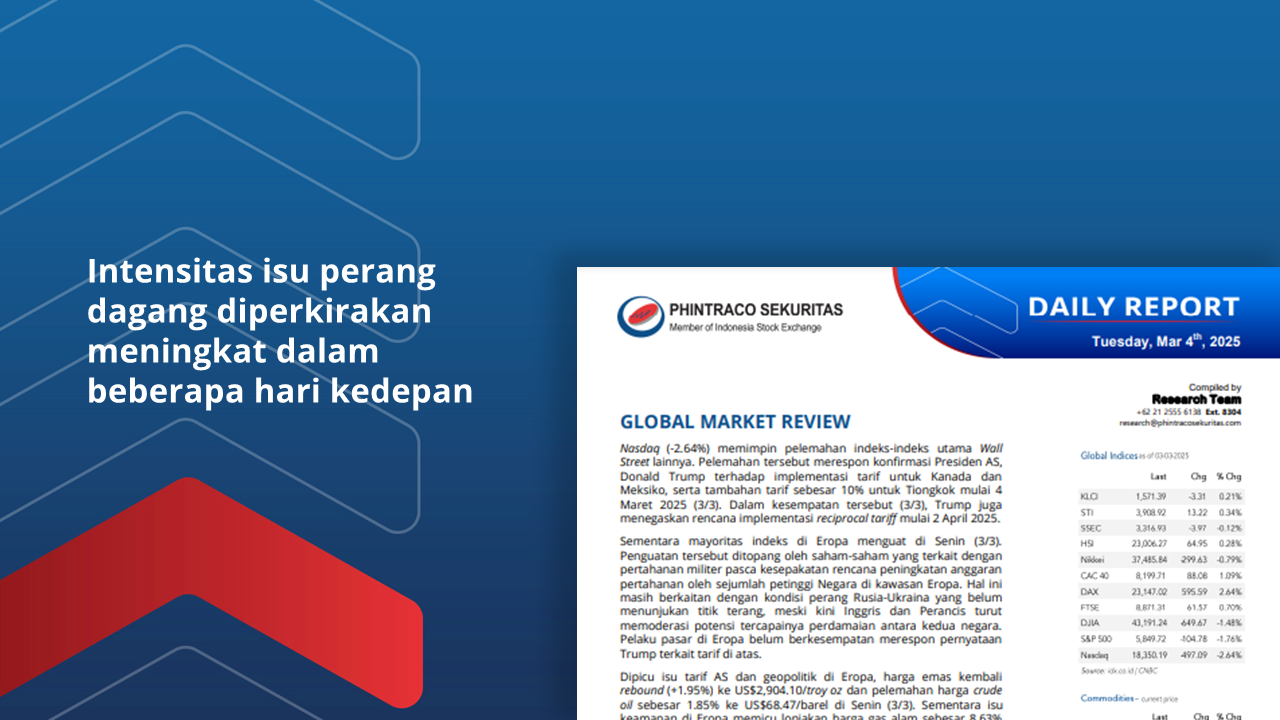 Nasdaq (-2.64%) memimpin pelemahan indeks-indeks utama Wall Street lainnya (3/3). Presiden AS, Donald Trump mengkonfirmasi implementasi tarif untuk Kanada dan Meksiko, serta tambahan tarif sebesar 10% untuk Tiongkok mulai 4...
