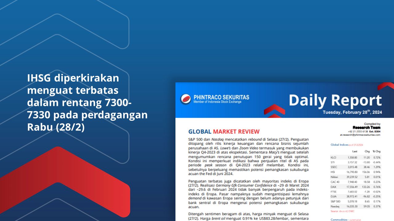 S&P 500 dan Nasdaq Rebound pada perdagangan (27/2) didorong oleh kinerja perusahaan AS yang kuat dan rencana bisnis yang optimis. Perlambatan penjualan ritel AS pada Q4-2023 mengindikasikan kemungkinan pemangkasan suku...