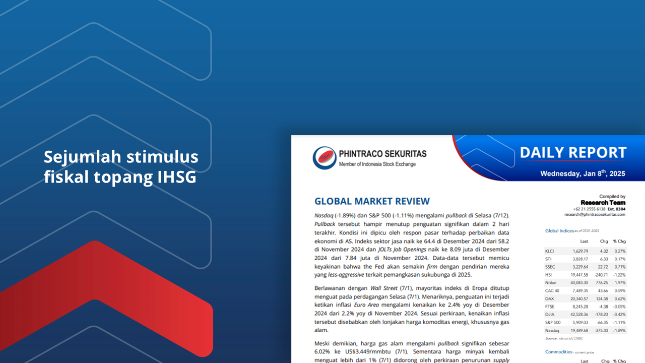 Indeks-indeks utama Wall Street menguat lebih dari 1% di Rabu (15/1). Realisasi inflasi inti AS berada di 3.2% yoy di Desember 2024, lebih rendah dari perkiraan di 3.3% yoy. Sebelumnya...