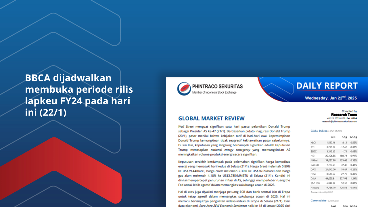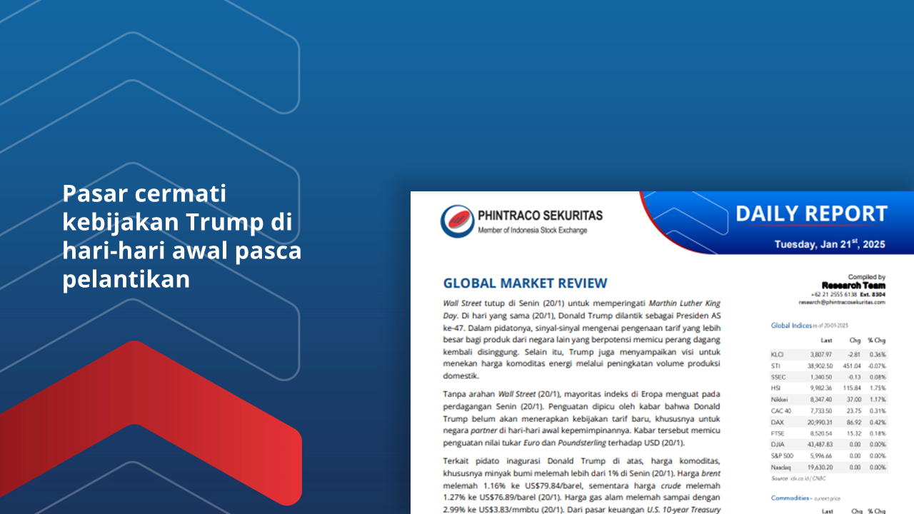 Wall Street menguat signifikan satu hari pasca pelantikan Donald Trump sebagai Presiden AS ke-47 (21/1). Pasar menilai bahwa kebijakan tarif di hari-hari awal kepemimpinan Donald Trump kemungkinan tidak seagresif kekhawatiran...