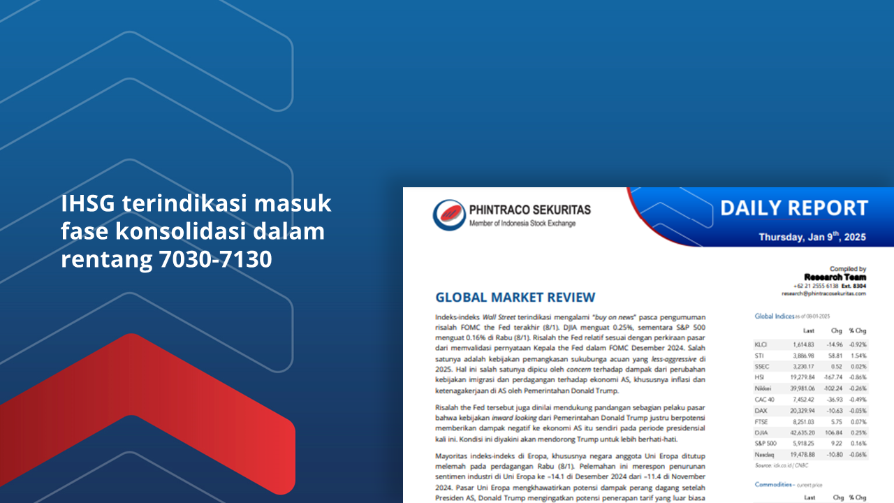 DJIA menguat 0.25%, sementara S&P 500 menguat 0.16% di Rabu (8/1). Risalah the Fed relatif sesuai dengan perkiraan pasar dari memvalidasi pernyataan Kepala the Fed dalam FOMC Desember 2024. Risalah...