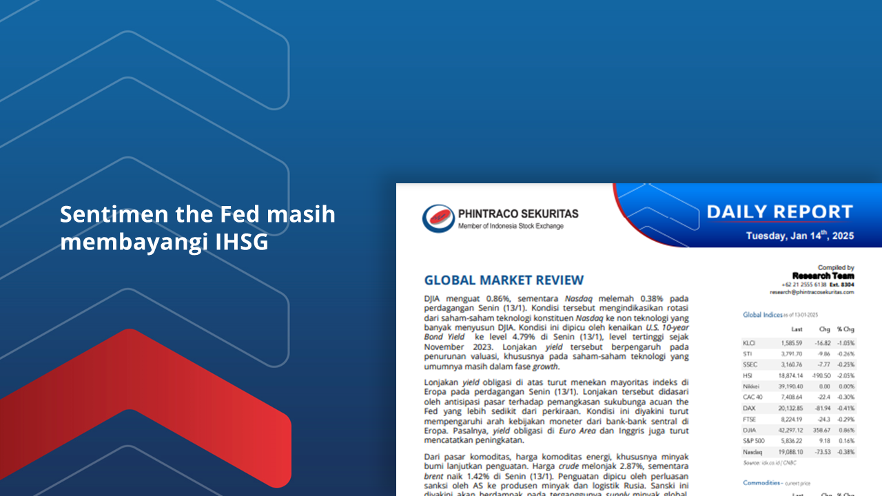 DJIA menguat 0.86%, sementara Nasdaq melemah 0.38% di Senin (13/1). Kondisi tersebut mengindikasikan rotasi dari saham-saham teknologi konstituen Nasdaq ke non teknologi yang banyak menyusun DJIA. U.S. 10-year Bond Yield...