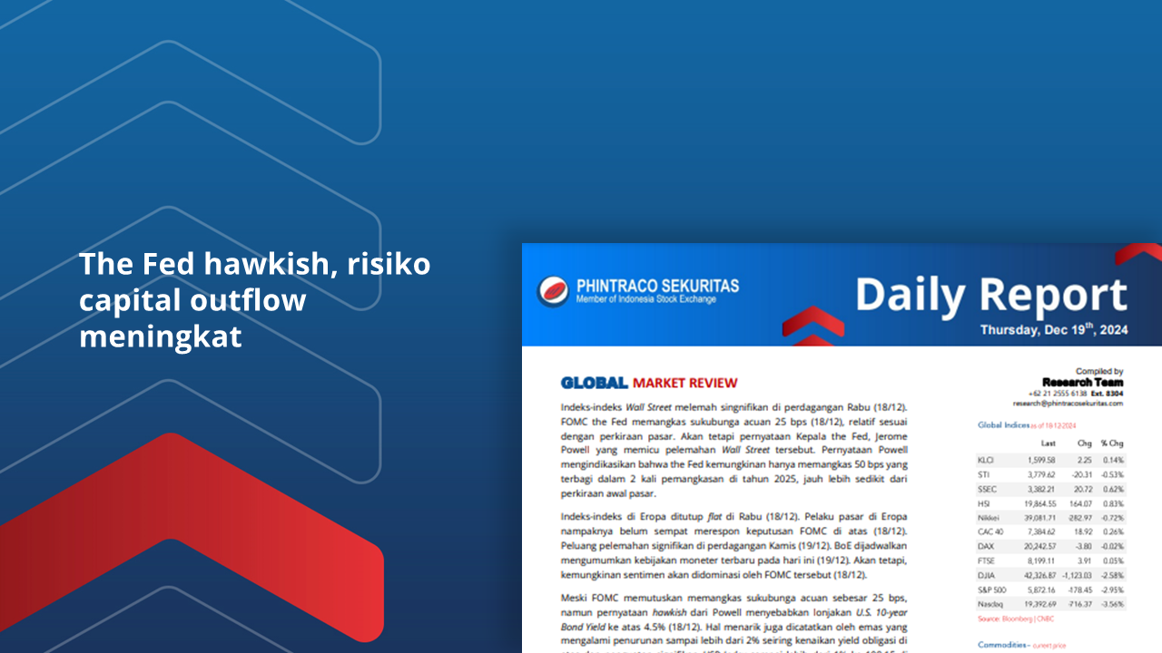 Indeks-indeks Wall Street melemah singnifikan di perdagangan Rabu (18/12). FOMC the Fed memangkas sukubunga acuan 25 bps (18/12). Pernyataan Powell mengindikasikan bahwa the Fed kemungkinan hanya memangkas 50 bps yang...