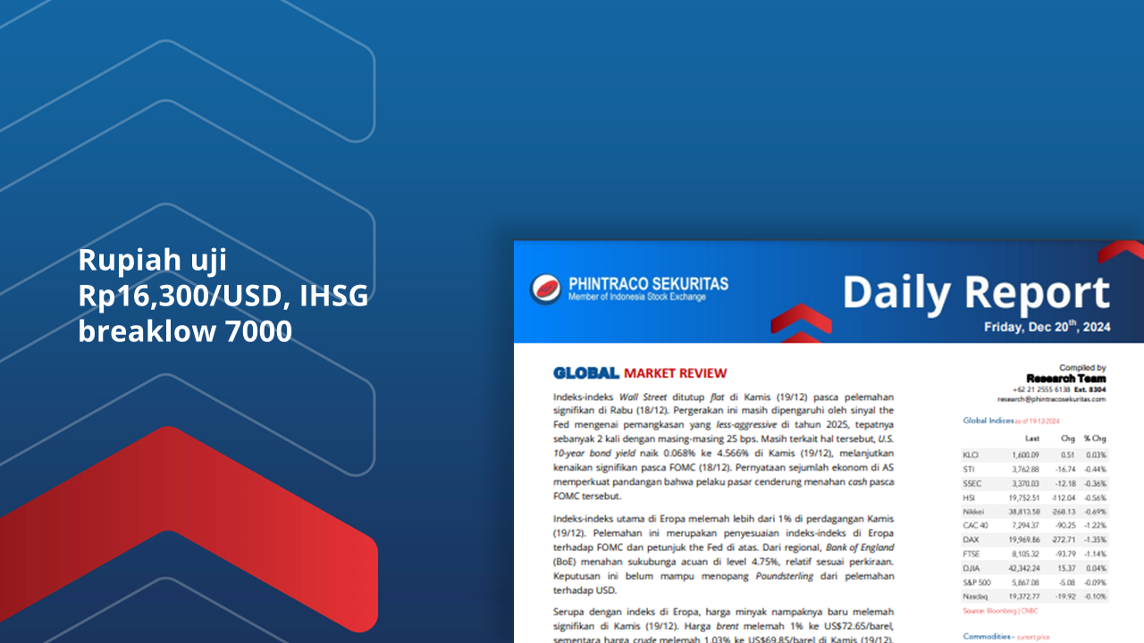 Indeks-indeks Wall Street ditutup flat di Kamis (19/12) pasca pelemahan signifikan di Rabu (18/12). Pergerakan ini masih dipengaruhi oleh sinyal the Fed mengenai pemangkasan yang less-aggressive di tahun 2025. U.S....