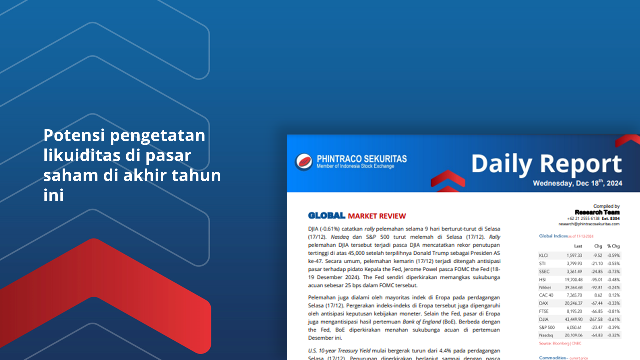 DJIA (-0.61%) catatkan rally pelemahan selama 9 hari berturut-turut di Selasa (17/12). The Fed diperkirakan memangkas sukubunga acuan sebesar 25 bps dalam FOMC tanggal 17-18 Desember 2024. Pasar berharap dan...