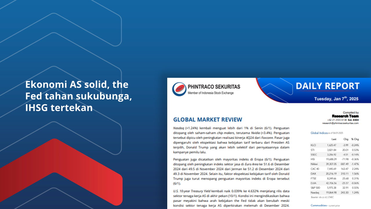 Nasdaq (+1.24%) kembali menguat lebih dari 1% di Senin (6/1). Penguatan ditopang oleh saham-saham chip makers, terutama Nvidia (+3.4%). Pasar juga dipengaruhi oleh ekspektasi bahwa kebijakan tarif terbaru dari Presiden...