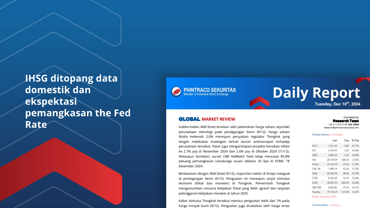 Nasdaq (+1.77%) dan S&P 500 (+0.82%) menguat signifikan di Rabu (11/12). Realisasi inflasi di AS sebesar 2.7% yoy di November 2024 sesuai ekspektasi. Data ini memicu kenaikan keyakinan pemangkasan sukubunga...