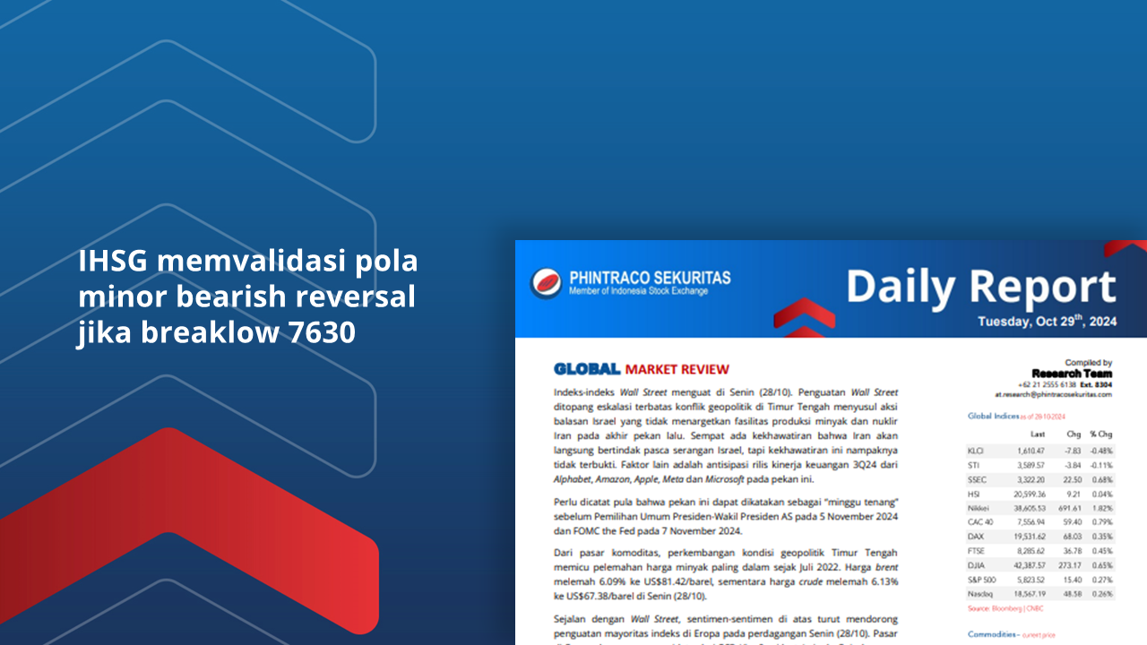 Indeks Wall Street berakhir mixed di Selasa (29/10). Nasdaq (+0.78%) ditopang antisipasi kinerja keuangan 3Q24 perusahaan teknologi. U.S. JOLTs Job Openings turun ke 7.443 juta di September 2024 dari 7.861...