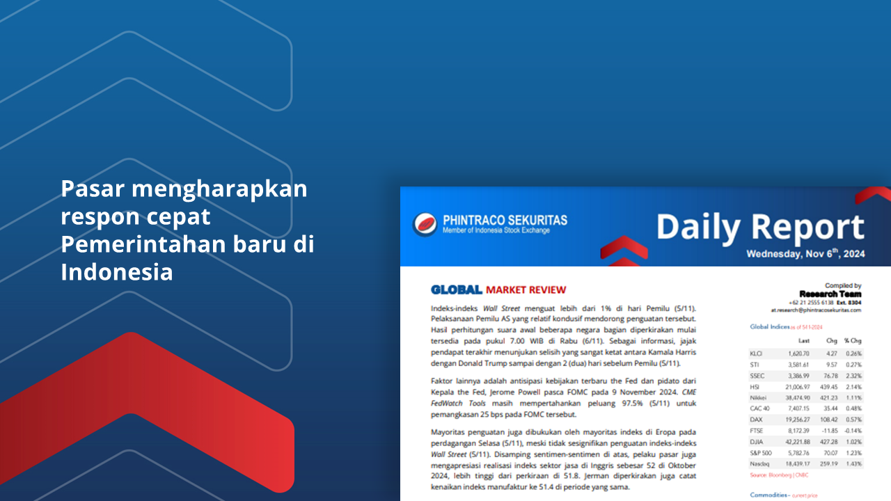 Indeks-indeks Wall Street menguat lebih dari 1% di hari Pemilu (5/11). Pelaksanaan Pemilu AS yang relatif kondusif mendorong penguatan tersebut. Hasil perhitungan suara awal beberapa negara bagian diperkirakan mulai tersedia...