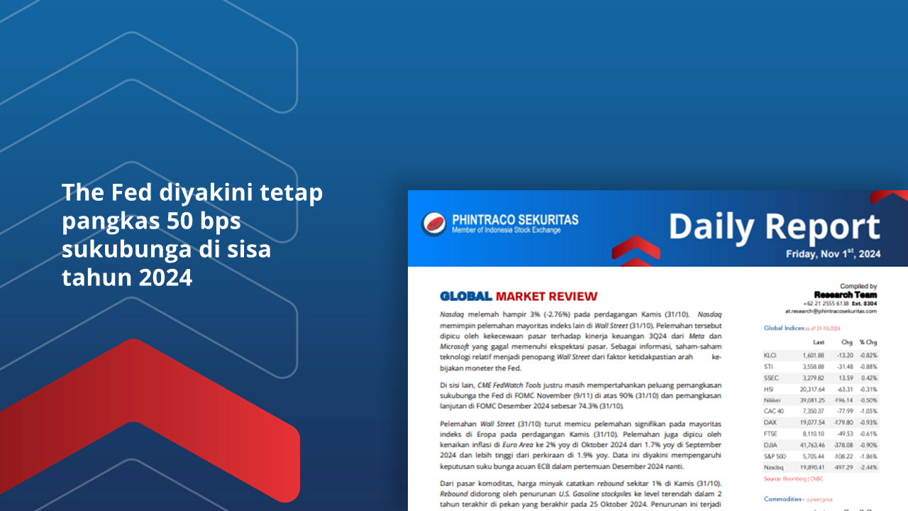 Nasdaq (-2.76%) memimpin pelemahan mayoritas indeks Wall Street pada perdagangan Kamis (31/10). Pelemahan tersebut dipicu oleh kekecewaan pasar terhadap kinerja keuangan 3Q24 dari Meta dan Microsoft yang gagal memenuhi ekspektasi...