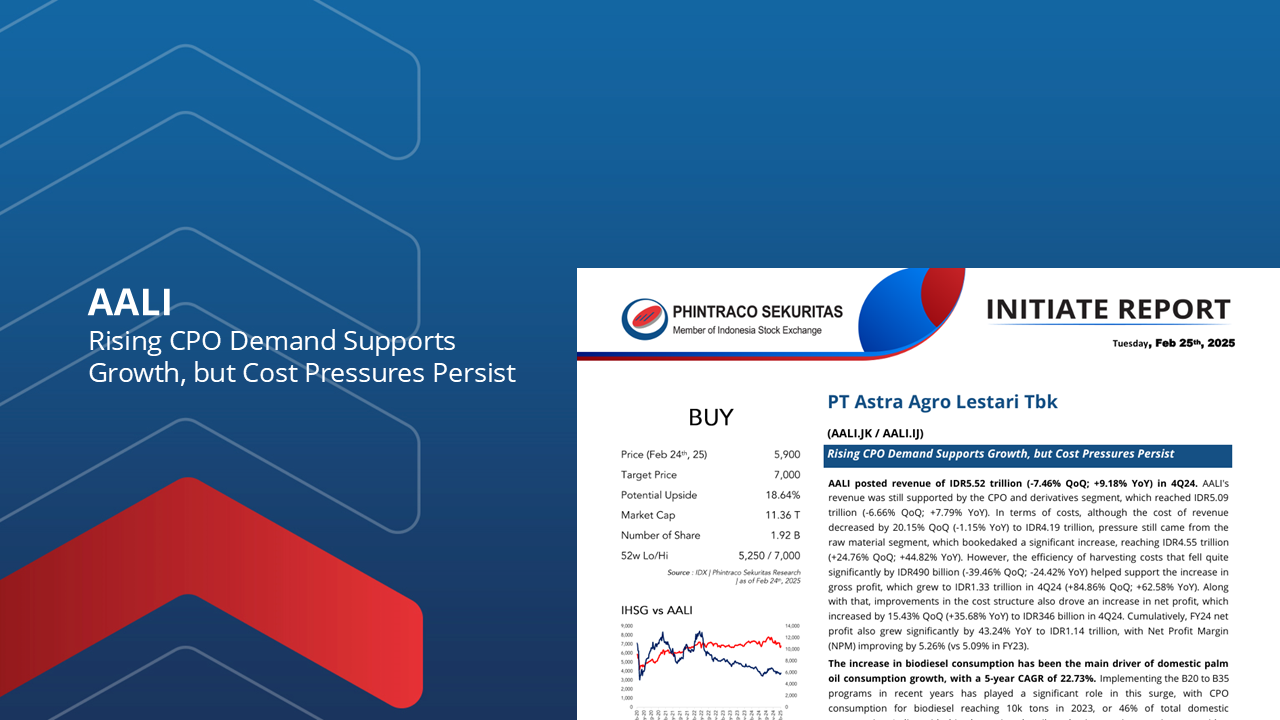 AALI posted revenue of IDR5.52 trillion in 4Q24 (-7.46% QoQ; +9.18% YoY), supported by the CPO and derivatives segment at IDR5.09 trillion (-6.66% QoQ; +7.79% YoY). Despite a 20.15% QoQ decline in the cost of revenue, rising raw material costs (+24.76% QoQ; +44.82% YoY). However, efficiency in harvesting costs (-39.46% QoQ) helped boost gross profit to IDR1.33 trillion (+84.86% QoQ; +62.58% YoY).