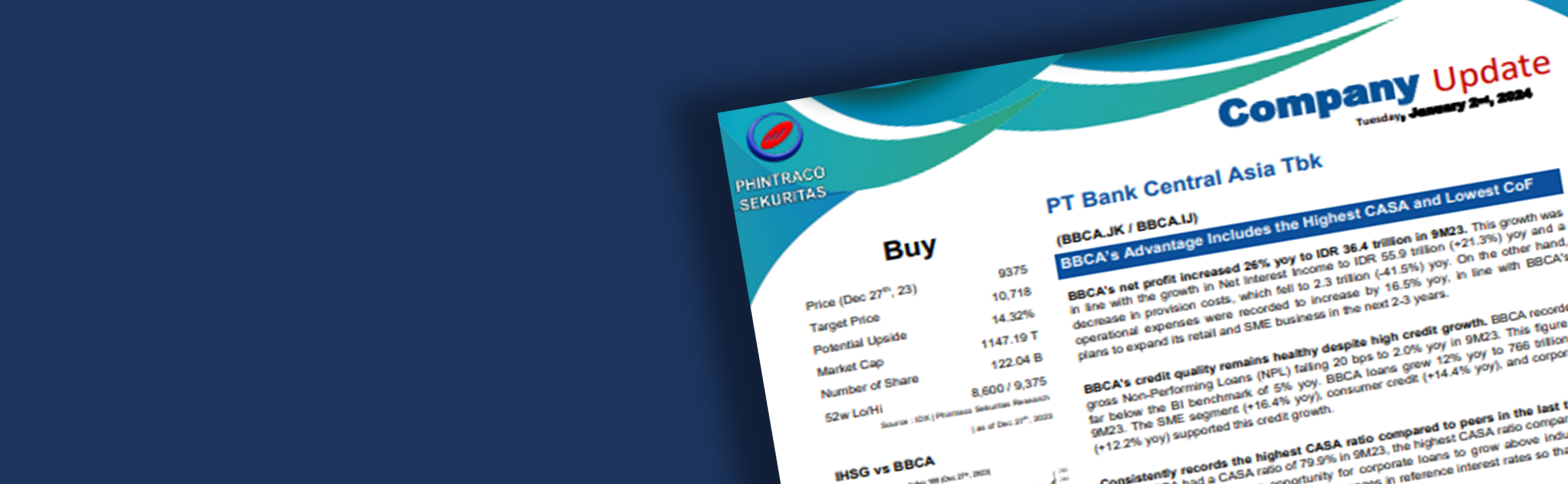 >BBCA’s net profit increased 26% yoy to IDR 36.4 trillion in 9M23.This growth was in line with the growth in NII (+21.3%) yoy and a decrease in provision costs (-41.5%) yoy.