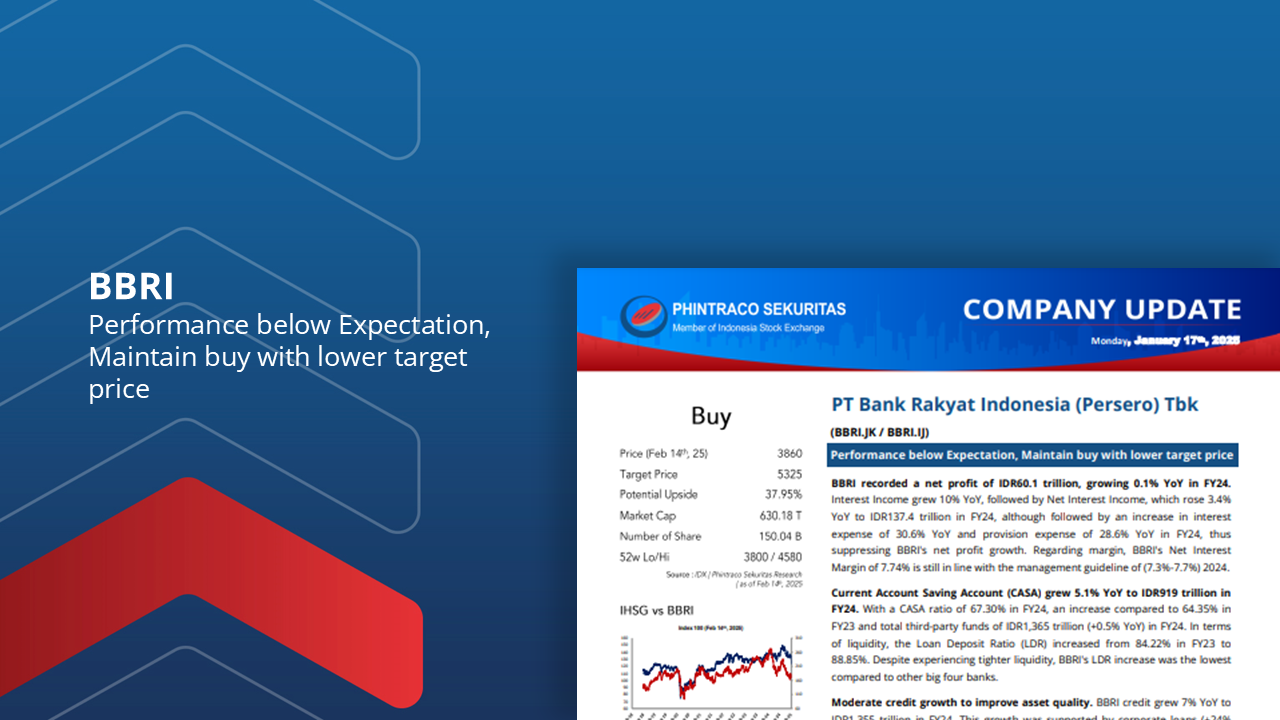 Based on BBRI’s FY24 performance using the Discounted Cash Flow method, we maintain a BUY rating for BBRI with a fair value of 5.325 (12.94x expected P/E) and a relative valuation below 2.27x its 5-year average P/E and a potential upside of 37.95%.