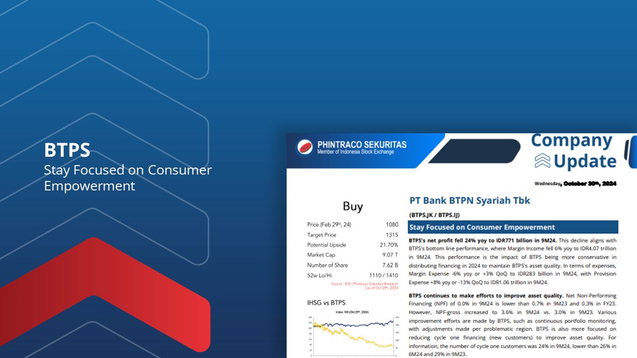 Net profit grew 52.72% yoy to IDR2.7 trillion in 9M24. This growth is in line with the increase in revenue of 37.75% yoy to IDR10.1 trillion in 9M24.