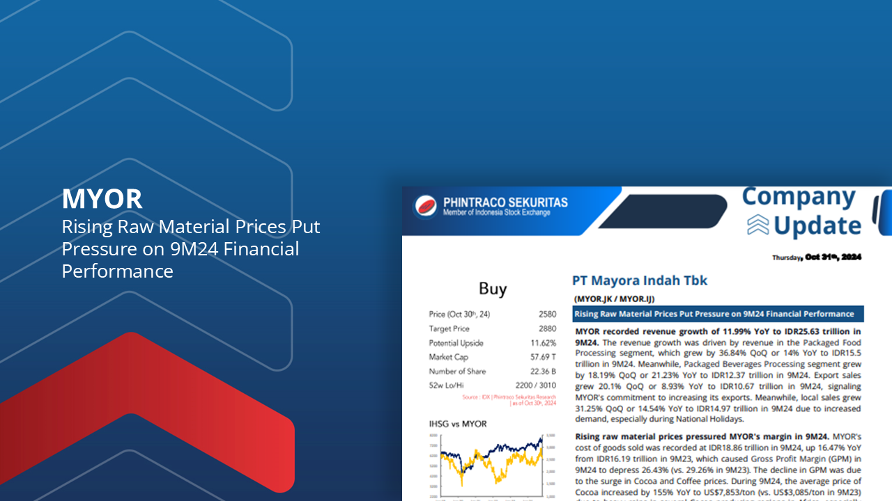 MYOR recorded a stable net profit at IDR2 trillion in 9M24. On a quarterly basis, MYOR’s net profit fell 50.47% QoQ to IDR308 billion in 3Q24 (vs. IDR606 billion in 2Q24). We assess MYOR’s net profit in 3Q24 to be depressed due to the surge in Cocoa and Coffee commodity prices, reducing MYOR’s GPM. MYOR’s net profit in 9M24 was below our estimate as it was only 62.72% of our FY24F.