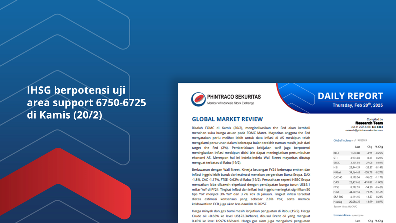 Kami memperkirakan IHSG berpotensi uji area support 6750-6725 di Kamis (20/2).