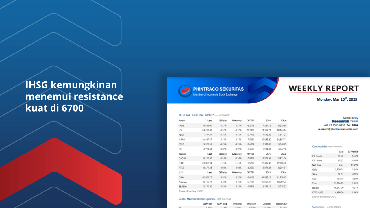 IHSG kemungkinan menemui resistance kuat di 6700 di awal pekan ini.