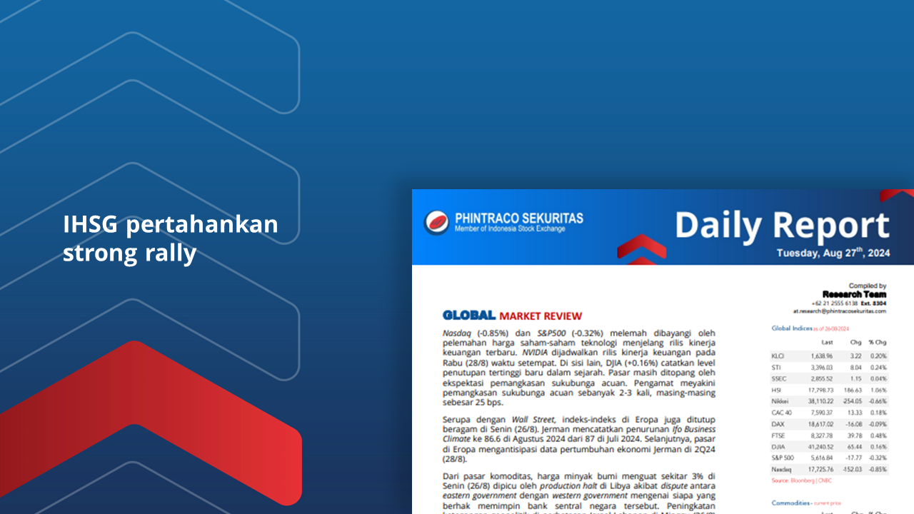 Jika IHSG mampu bertahan diatas level 7600, maka IHSG berpotensi lanjutkan penguatan uji 7650 di Selasa (27/8).