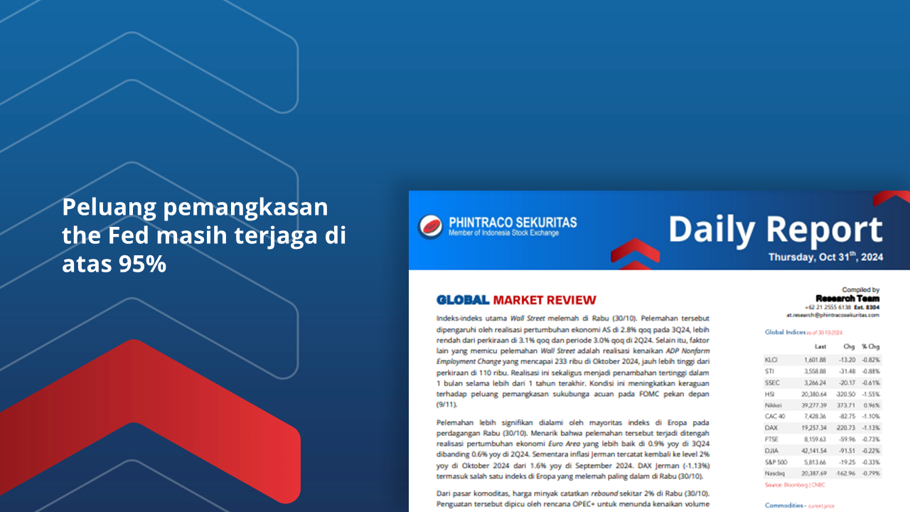 Meski demikian, CME FedWatch Tools mencatat peluang pemangkasan 25 bps masih bertahan di atas 95% pada FOMC tersebut (30/10).