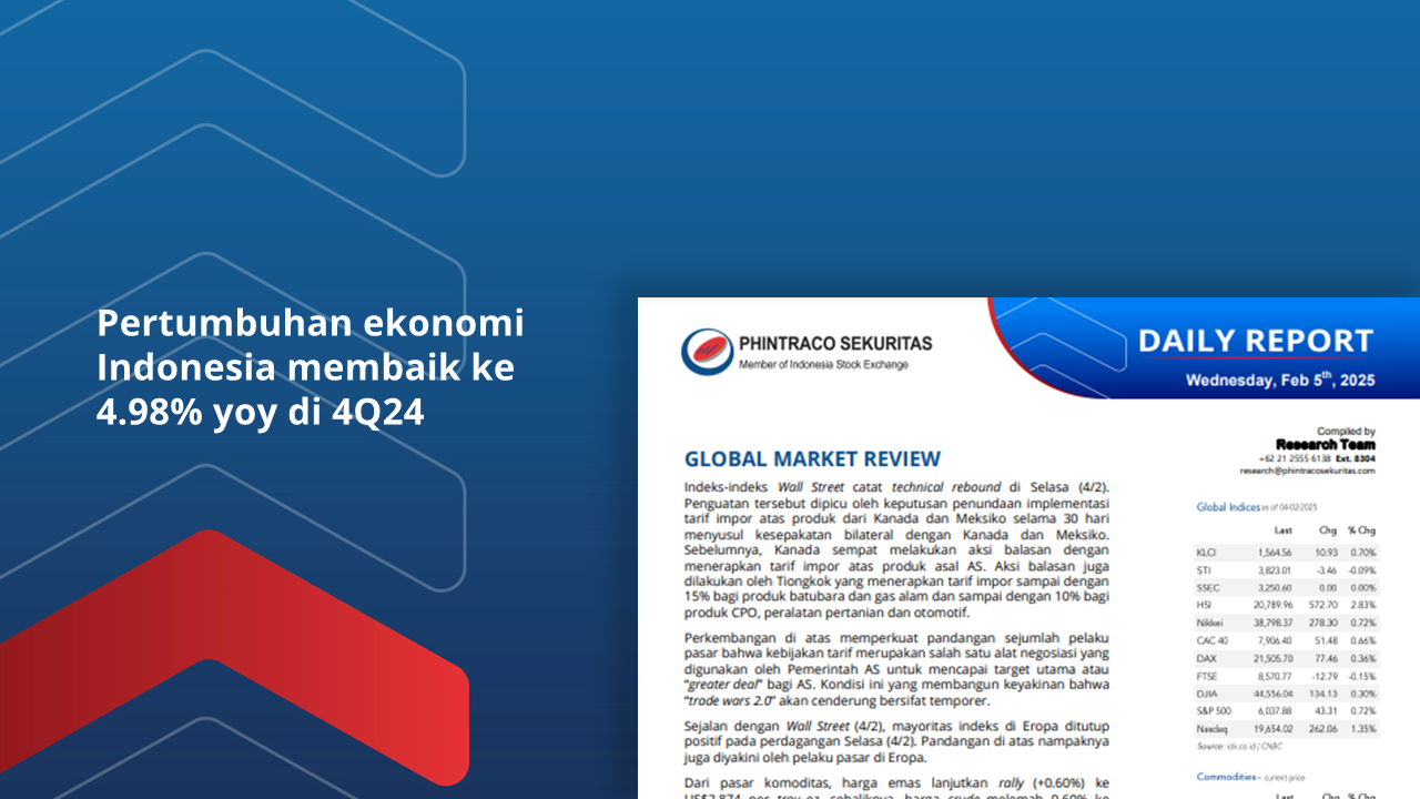 Pertumbuhan ekonomi Indonesia membaik ke 4.98% yoy di 4Q24