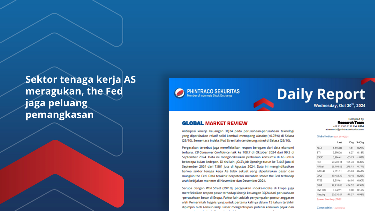 Pasar masih hasil major review IDX80, LQ45 dan IDX30 yang akan efektif pada 1 November 2024 dan antisipasi major review oleh MSCI pada 7 November 2024.