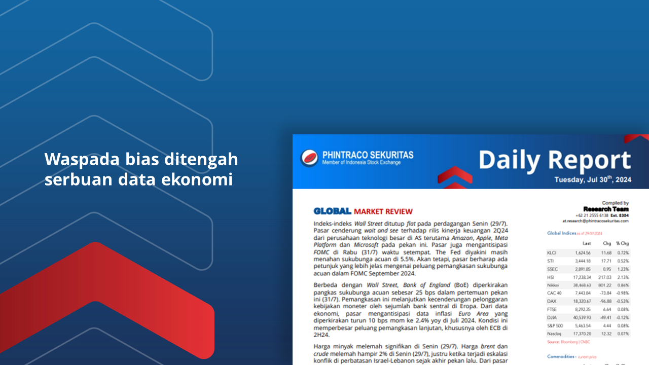 Dari dalam negeri, terdapat kecenderungan wait and see ditengah antisipasi data kinerja keuangan 2Q24, inflasi Juli 2024, Foreign Direct Investment 2Q24 hingga pertumbuhan ekonomi 2Q24.
