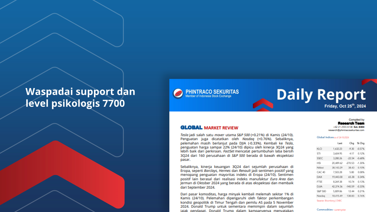 Waspadai support dan level psikologis 7700 pada pergerakan IHSG di Jumat (25/10).