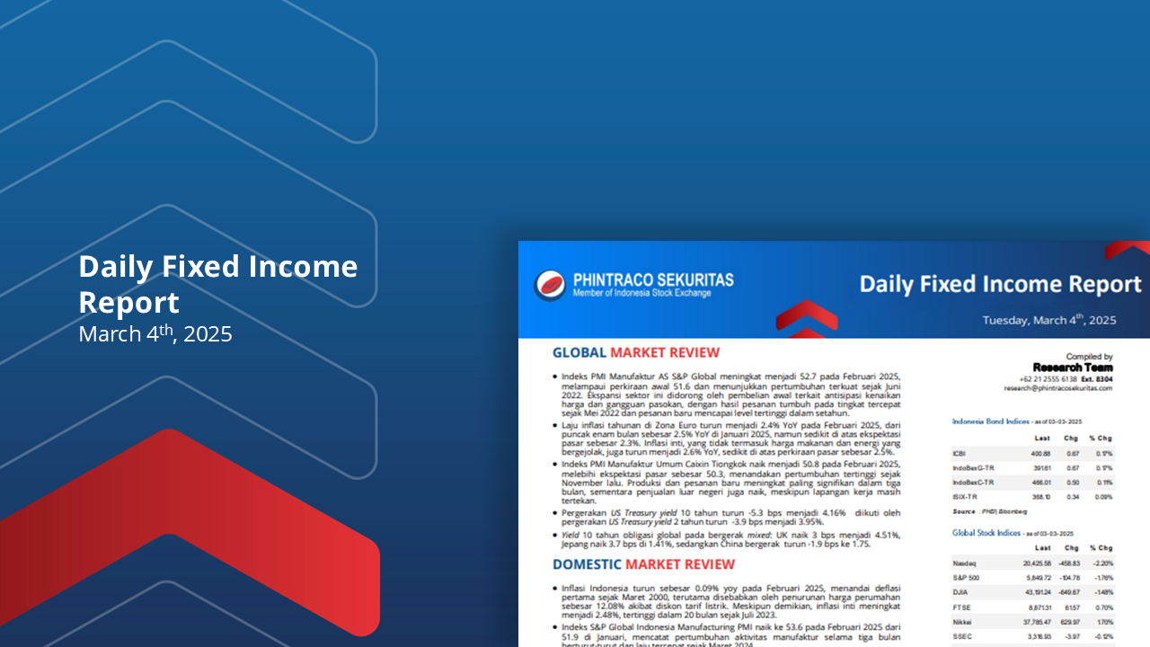 Inflasi Indonesia turun sebesar 0.09% yoy pada Februari 2025, menandai deflasi pertama sejak Maret 2000, terutama disebabkan oleh penurunan harga perumahan sebesar 12.08% akibat diskon tarif listrik. Meskipun demikian, inflasi inti meningkat menjadi 2.48%, tertinggi dalam 20 bulan sejak Juli 2023. Indeks S&P Global Indonesia Manufacturing PMI naik ke 53.6 pada Februari 2025 dari 51.9 di Januari, mencatat pertumbuhan aktivitas manufaktur selama tiga bulan berturut-turut dan laju tercepat sejak Maret 2024.