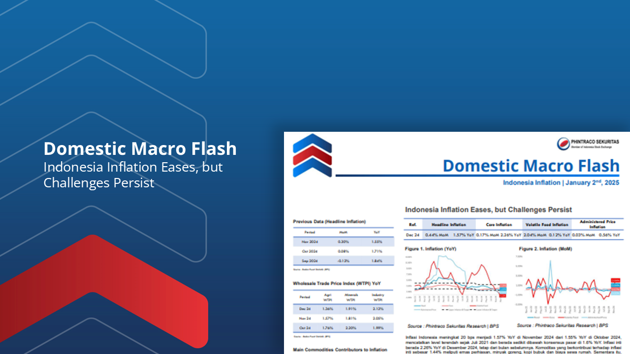 Inflasi Indonesia meningkat 20 bps menjadi 1.57% YoY di November 2024 dari 1.55% YoY di Oktober 2024, mencatatkan level terendah sejak Juli 2021 dan berada sedikit dibawah konsensus pasar di 1.6% YoY. Inflasi inti berada 2.26% YoY di Desember 2024, tetap dari bulan sebelumnya. Komoditas yang berkontribusi terhadap inflasi inti sebesar 1.44% meliputi emas perhiasan, minyak goreng, kopi bubuk dan biaya sewa rumah. Sementara itu, kelompok volatile food mengalami inflasi sebesar 0.12% YoY di Desember 2024, dari deflasi sebesar 0.32% YoY di November 2024, terutama disebabkan oleh kenaikan harga telur ayam ras, cabai merah dan cabai rawit. Inflasi harga yang diatur pemerintah tumbuh 0.56% YoY pada November 2024, turun dari 0.82% YoY di November 2024, dengan kontribusi utama dari produk sigaret kretek tangan, mesin dan sigaret putih mesin.
