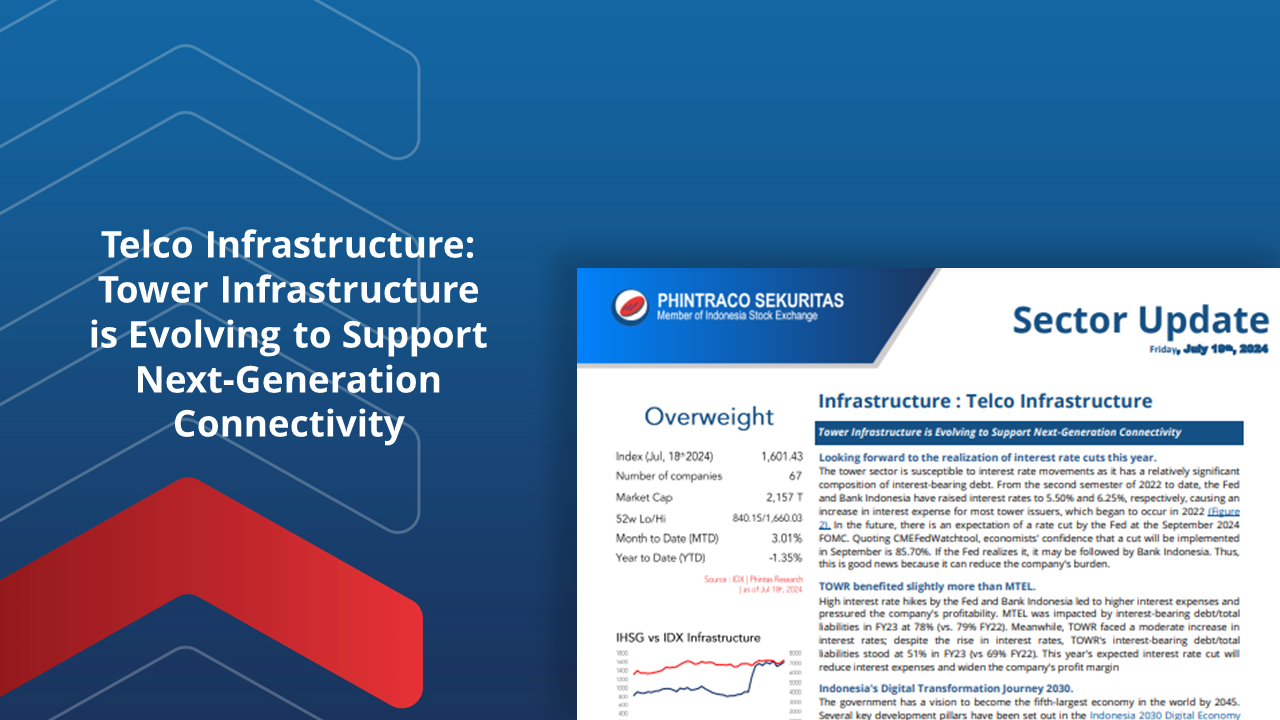 We recommend overweight on the tower sector due to continued demand growth driven by government focus on infrastructure for Indonesia Emas 2045, with Top Picks TOWR (target price IDR850) and MTEL (target price IDR720), as well as upside risk from demand growth and realization of interest rate cAut.