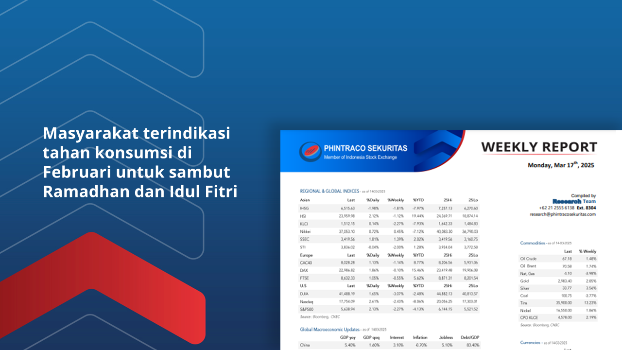 Proyeksi kondisi ekonomi Tiongkok terbaru tersebut memvalidasi keputusan implementasi stimulus “jumbo” sejak 4Q24. Tiongkok berupaya memaksimalkan konsumsi domestik untuk menyerap produksi manufaktur dan jasa domestik Tiongkok.